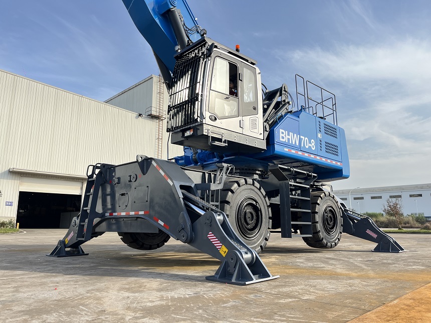BHW70輪胎式港口碼頭抓鋼機(jī)適用于鋼廠料場(chǎng)裝卸廢鋼、裝卸火車皮物料、港口碼頭裝卸物料,廢鋼等,具有以下特點(diǎn):